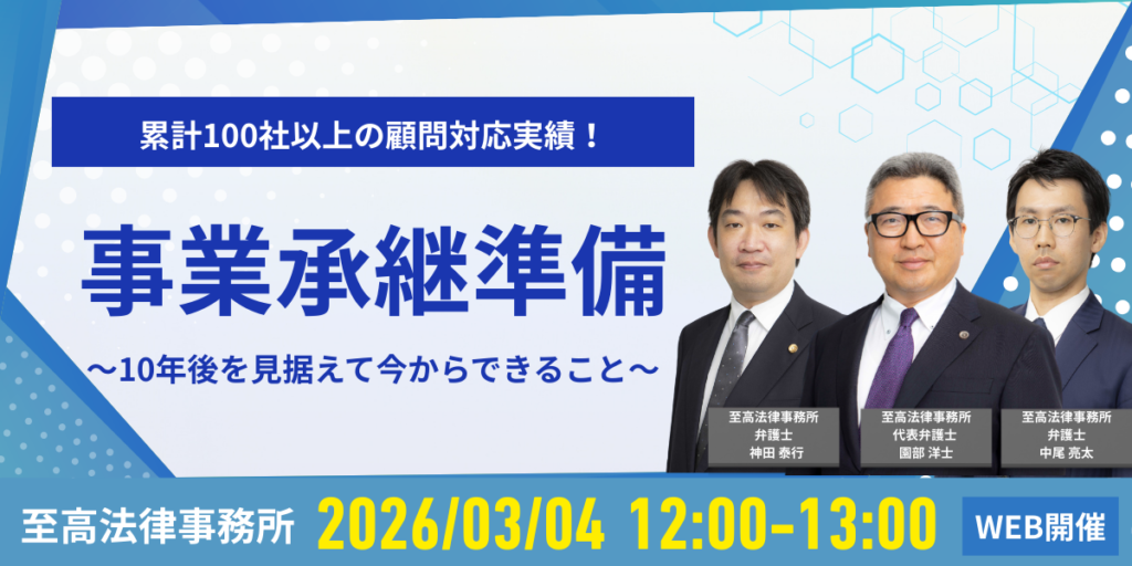 本セミナーでは、累計100社以上の弊所のサポート実績をもとに、事業承継トラブルを未然に防ぎ、次世代へ確実に会社を受け継ぐための勘所をお伝えします。